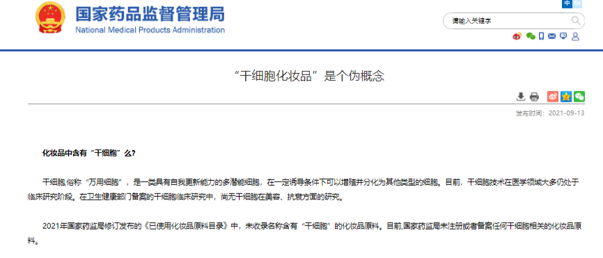 2021年國家藥監局修訂發布的《已使用化妝品原料目錄》中,未收錄名稱含有“干細胞”的化妝品原料。目前,國家藥監局未注冊或者備案任何干細胞相關的化妝品原料。