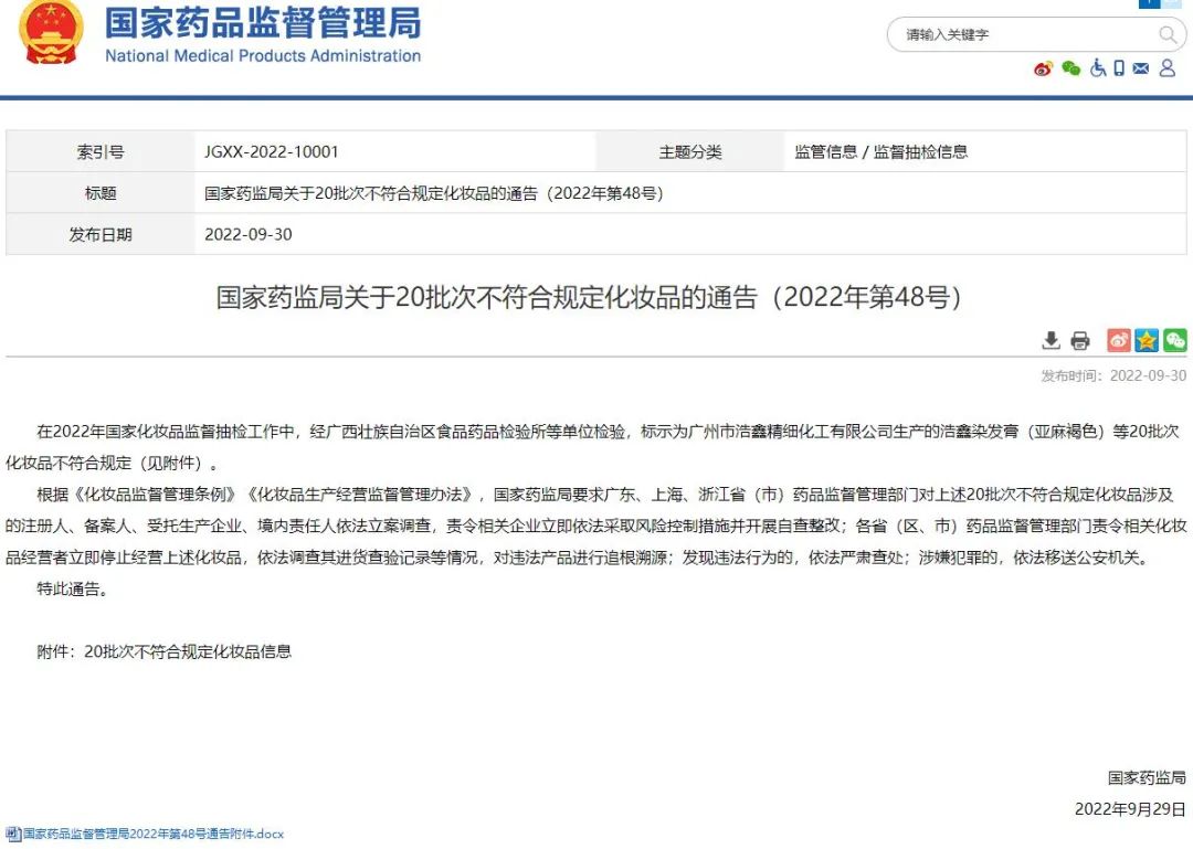 根據《通告》,在2022年國家化妝品監督抽檢工作中,經廣西壯族自治區食品藥品檢驗所等單位檢驗,標示為廣州市浩鑫精細化工有限公司生產的浩鑫染發膏(亞麻褐色)等20批次化妝品不符合規定。