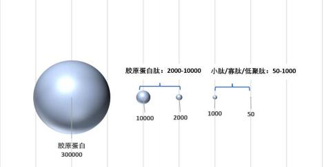 在經過酶解和熱水解處理后,膠原蛋白會轉化為膠原蛋白肽,從大分子蛋白質轉變為小分子膠原蛋白,分子量從300000道爾頓左右變為2000-10000道爾頓左右,這使得膠原蛋白肽比膠原蛋白更易吸收,功效作用更強,目前研究顯示,500道爾頓左右分子量的膠原蛋白小肽最適合人體吸收利用。