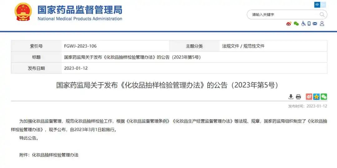 1月12日,國家藥監局公布《化妝品抽樣檢驗管理辦法》(下稱《管理辦法》),新規將于2023年3月1日起施行,主要包括抽檢計劃指定、抽樣內容、檢驗和結果報送、異議和復檢等內容。