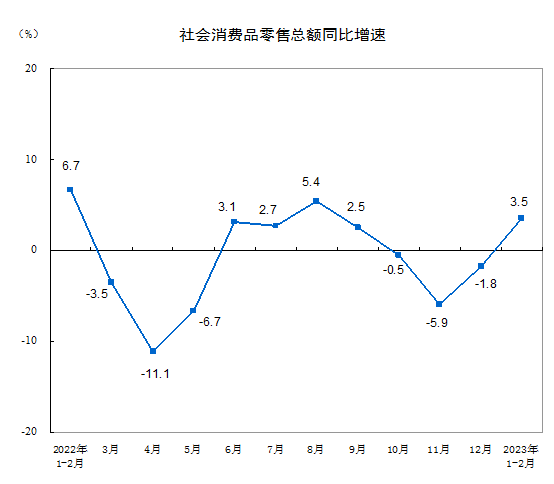 2023年3月15日,國家統計局發布2023年1-2月份社會消費品零售數據,數據顯示,1—2月社會消費品零售總額達77067億元,同比增長3.5%。