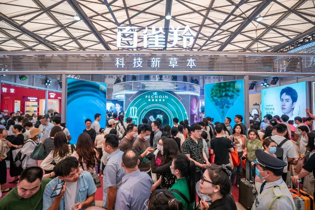 在此次美博會上,如果要說起對哪個展館的印象最深,在W1H09的百雀羚展臺肯定是其中之一。在逛展的兩天時間里,隨處可見參展者背著百雀羚的購物袋逛展,展臺前也是人潮洶涌。