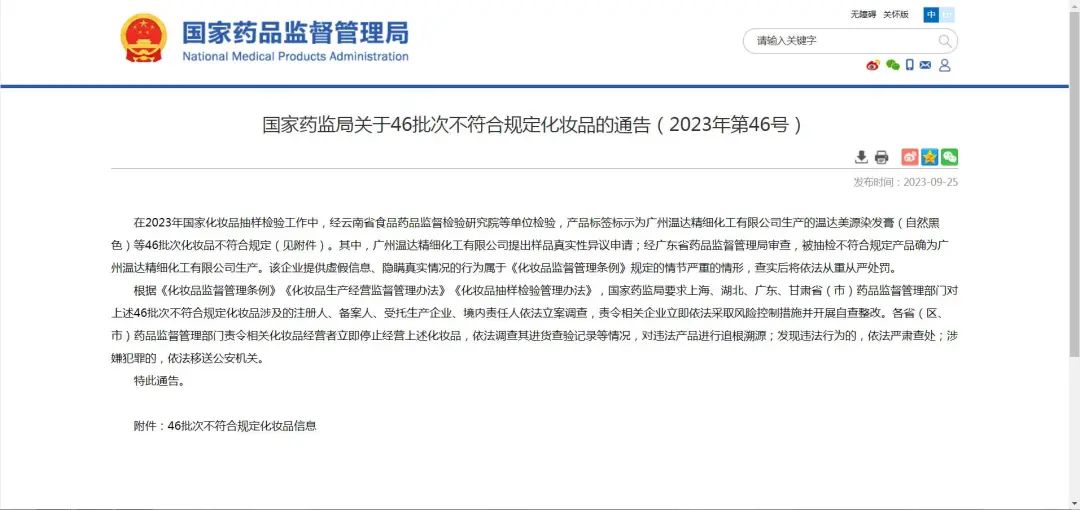 9月25日,國家藥監局發布關于46批次不符合規定化妝品的通告。